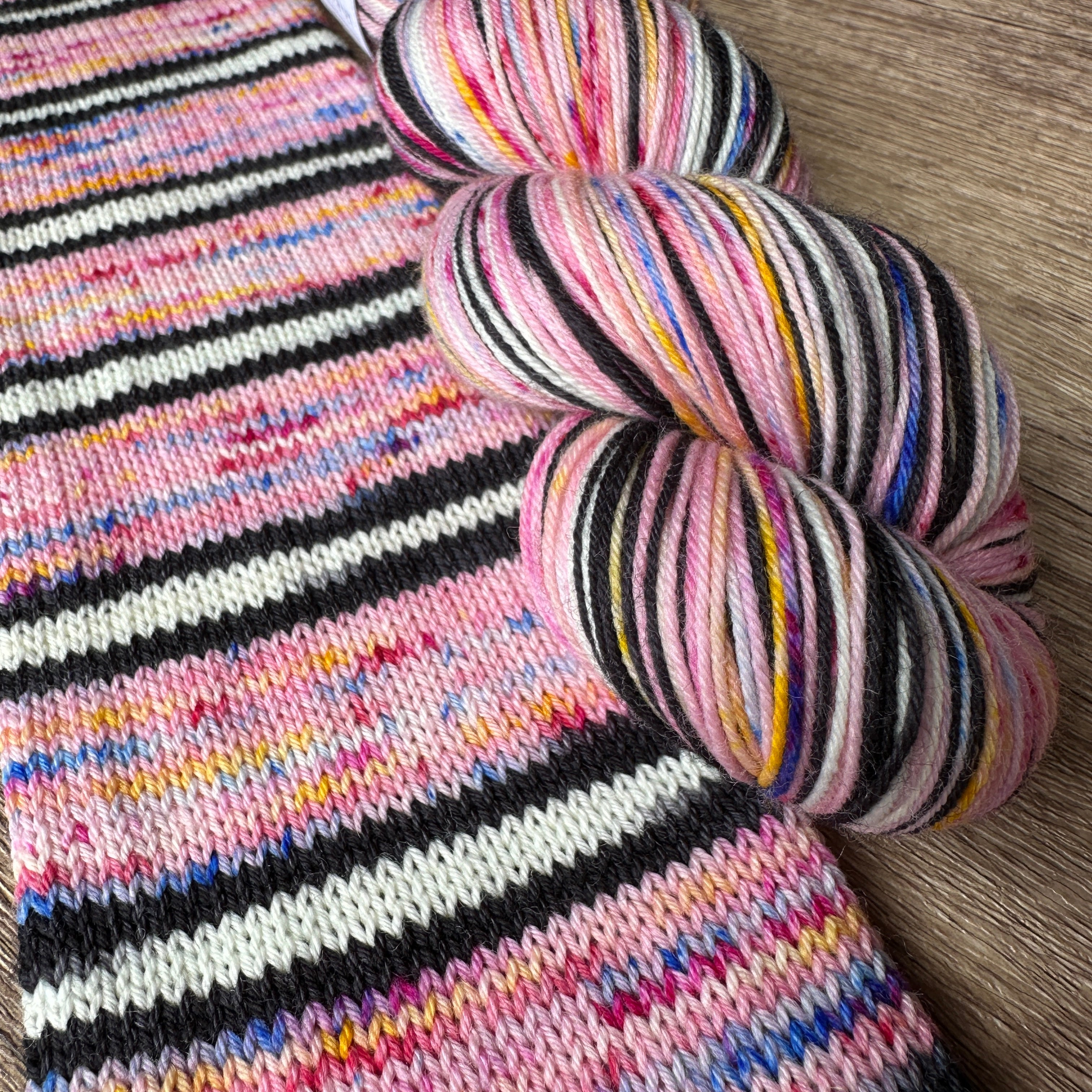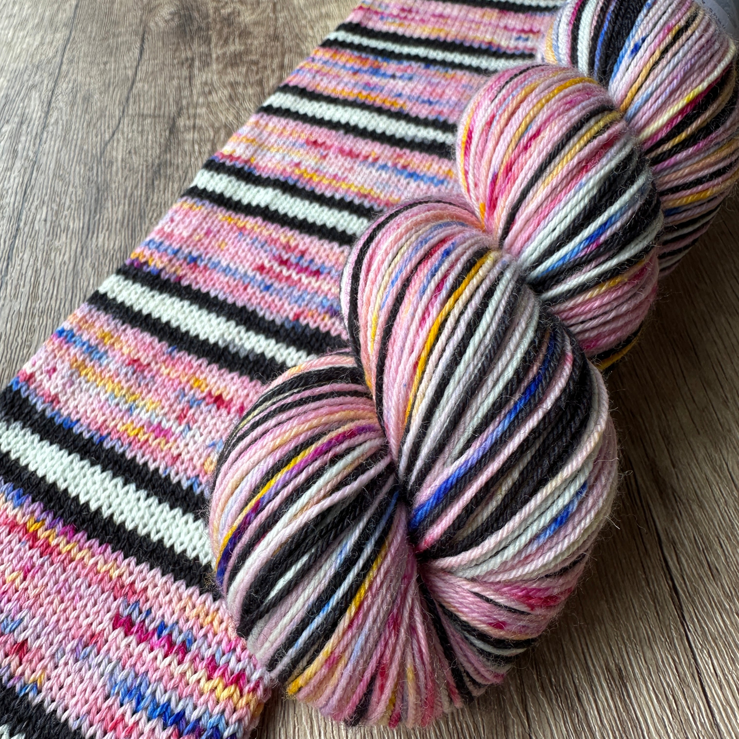 Inspired by Marty's unforgettable undercover look in Madagascar 3, this colorway is a full-on technicolor explosion. Zebra stripes, punchy polka dot vibes, and circus-level energy make this skein a party from cast-on to bind-off.