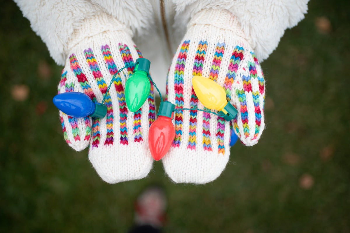 From the Designer Cori Eichelberger aka Irocknits: Designed as a childhood memory of snow streets with holiday lights as I grew up on a street in Sioux Falls, South Dakota, where entire neighborhoods were decorated for the month of December for families to bundle up with hot chocolate in the car and slowly drive around Reindeer Lane, Lollipop Lane, Santa Claus Court and Candy Cane Lane. Car headlights were turned off; windows were cracked and one home played holiday music on an old crackly speaker.