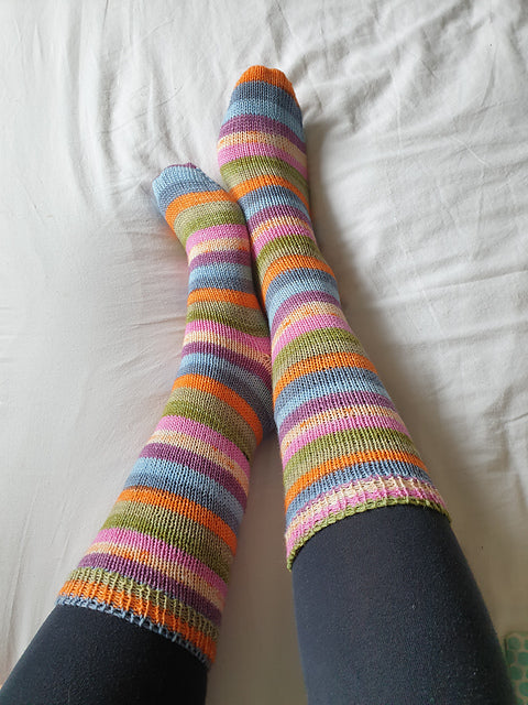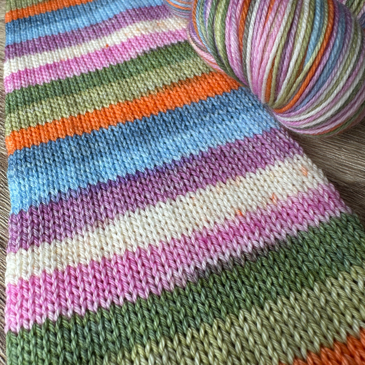 Perfect Sock Self-Striping is the most joyous yarn. For years I have been knitting my simple sock pattern (cast on 56 stitches, Needle size 1) and the yarn does ALL the work. Before I know it, I have knit a work of art. Woodstock 50 has been my most recent project and it delivers on the joy. But ... picking out a new colorway is always the best part. What should I choose next? Attached is the Gingerbread colorway. (Woodstock 50 is blocking!)