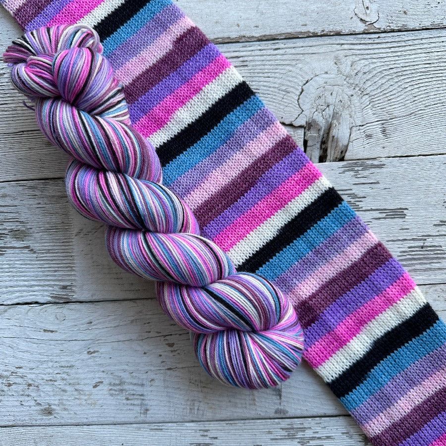 Perfect Sock Self-Striping is the most joyous yarn. For years I have been knitting my simple sock pattern (cast on 56 stitches, Needle size 1) and the yarn does ALL the work. Before I know it, I have knit a work of art. Woodstock 50 has been my most recent project and it delivers on the joy. But ... picking out a new colorway is always the best part. What should I choose next? Attached is the Gingerbread colorway. (Woodstock 50 is blocking!)