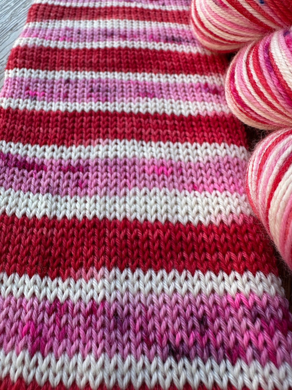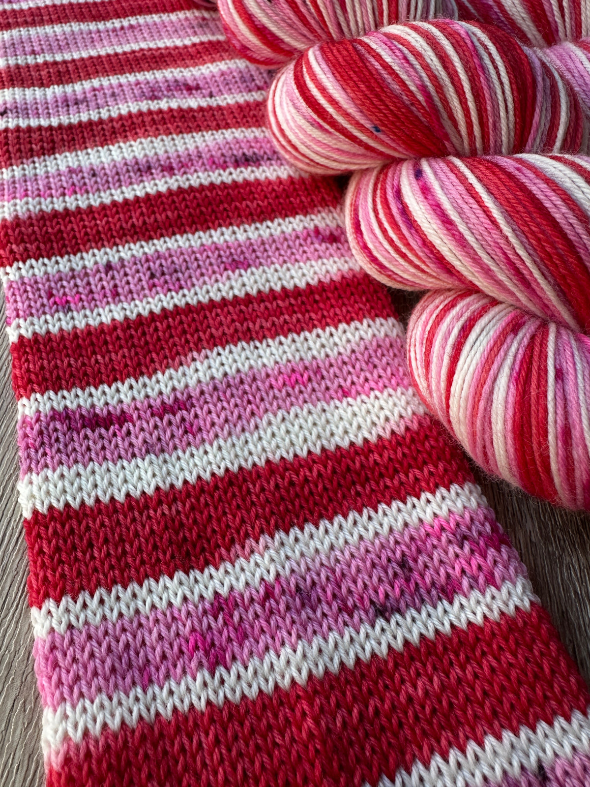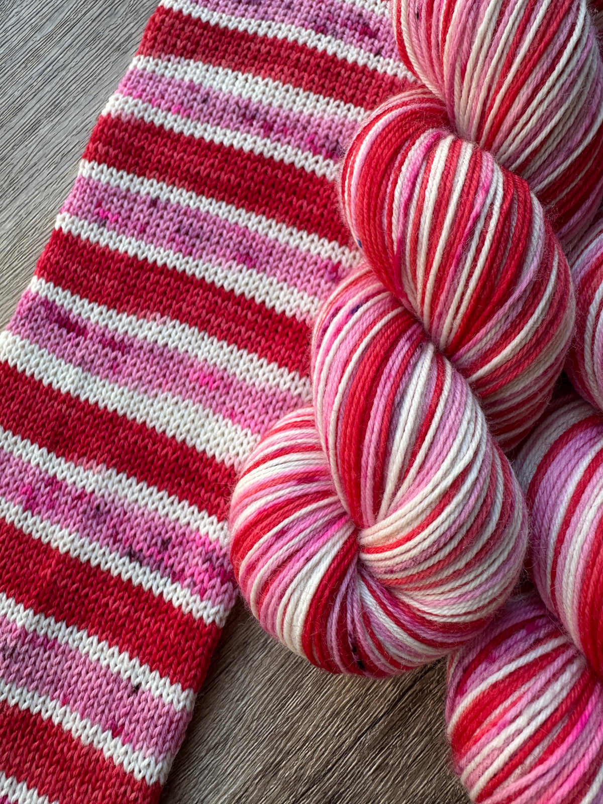 Inspired by the phrase “single and ready to mingle” and the unapologetic confidence of flamingos, this colorway pairs bold reds and clean whites with flirty pink stripes, accented by hand-painted speckles for extra charm. It’s festive without being saccharine, fun without trying too hard, and perfect for celebrating self-love, independence, or simply a very good pink.