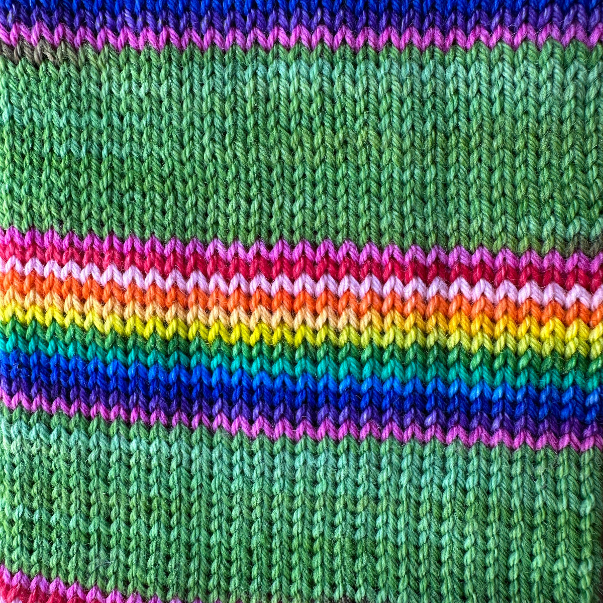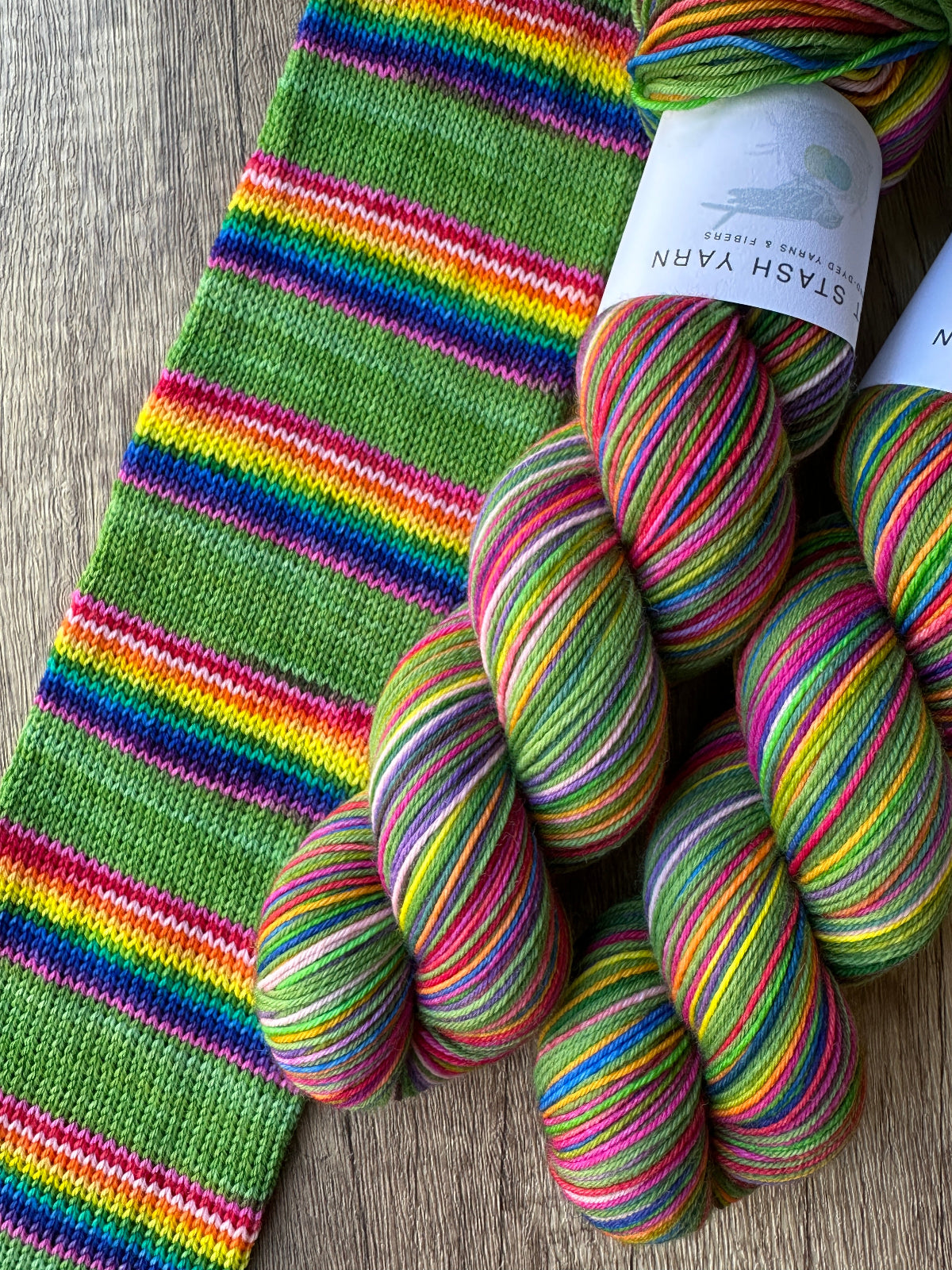 Get Lucky features an extra-wide verdant stripe and 16 mini-pot-of-gold-rainbow-stripes that are so cheerful, it will Riverdance its way onto your needles! Debuted St. Patty's Day 2025.