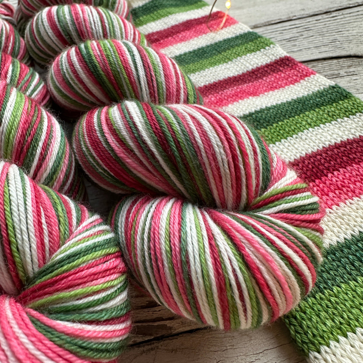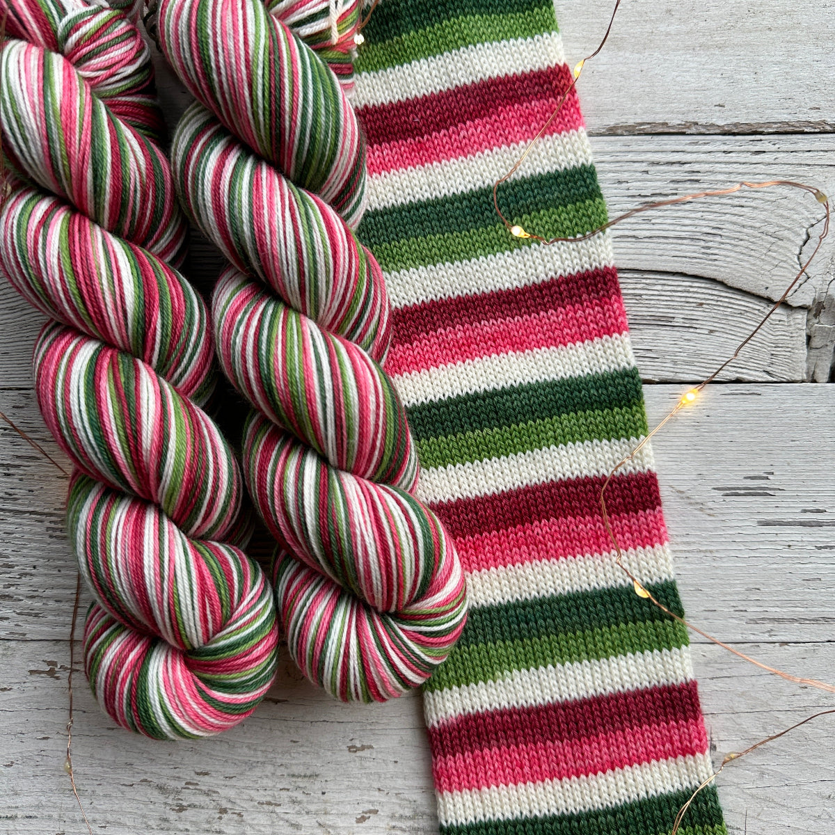 Classic Christmas! This sweet colorway would look amazing in a slip stitch or chevy pattern!