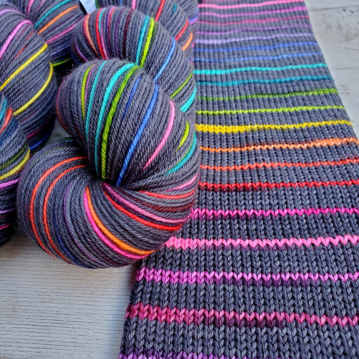 32 alternating stripes of neon rainbow and black for an out of this world knitting experience.